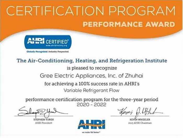 Недавно Институт кондиционирования, отопления и холодоснабжения (AHRI) опубликовал список наград "AHRI Performance Award". Gree в очередной раз получила награду за 100% успех в программе сертификации производительности AHRI.