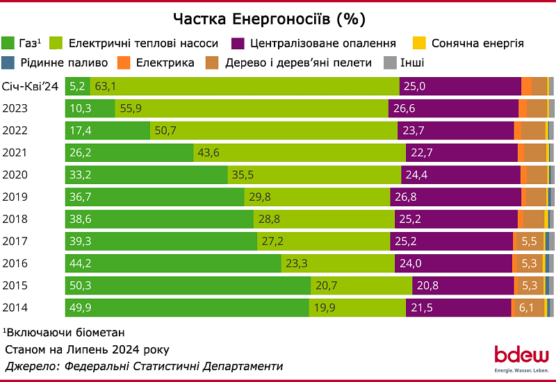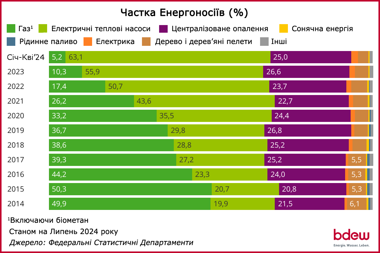 В начале 2024 года отопительный тепловой насос с электрическим приводом являлся лидером в сегменте нового жилищного строительства с рыночной долей 63,1%. С начала 2020 года тепловой насос является лидером рынка, а с 2022 года – абсолютным лидером рынка с рыночной долей 50,7%. Газовое отопление доминировало на рынке новостроек в 2015 году с рыночной долей 50,3%, но только благодаря одноразовым опережающим эффектам из-за строгих требований Закона EnEV 2016.